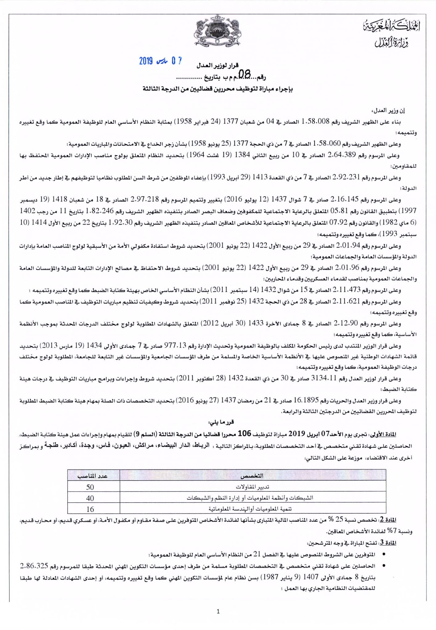 الصفحة الرئيسيةاعلانات وظيفية مباراة لتوظيف 106 محرر قضائي من الدرجة الثالثة - تخصص تدبير المقاولات والإعلاميات نشرهمدير الموقع •الخميس, مارس 07, 2019 0 تعلن وزارة العدل أنها ستنظم مباراة لتوظيف محررين قضائيين من الدرجة الثالثة: قرار وزير العدل رقم 08 م م ب بتاريخ 07 مارس 2019 التسجيل الإلكتروني (يعتبر يوم السبت 23 مارس 2019 آخر أجل للتسجيل الإلكتروني) الأقسام: اعلانات وظيفية امتحانات ومبارايات Facebook Twitter